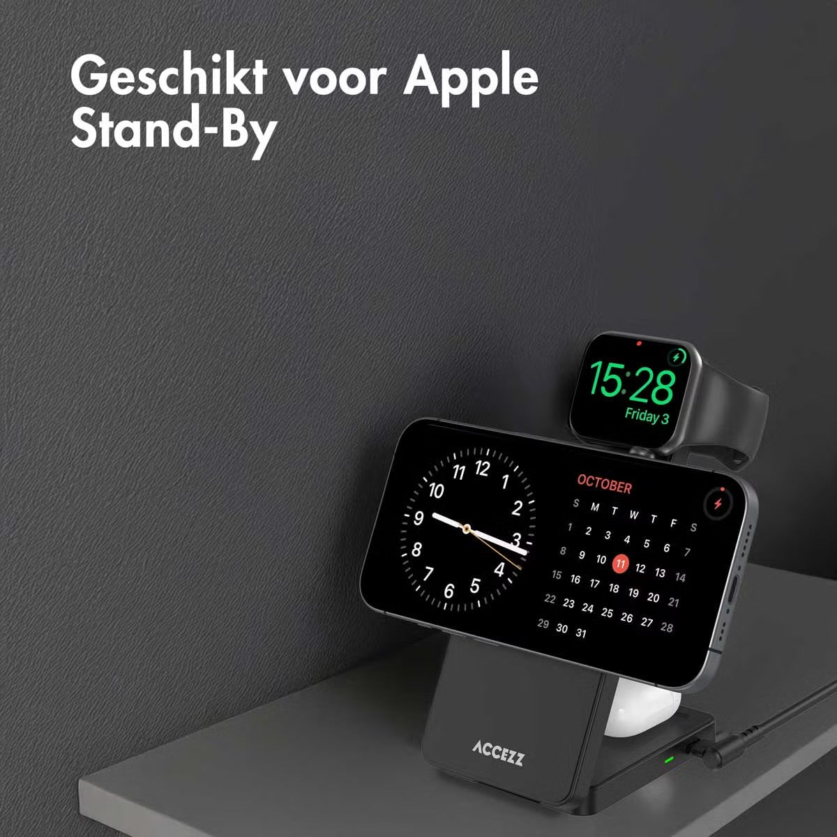 De Accezz 3-in-1 MagSafe oplader is perfect voor op je nachtkastje. Je iPhone, Apple Watch en AirPods hebben ‘s nachts een vaste plek en de volgende ochtend zijn ze weer opgeladen en klaar voor een nieuwe dag. Draai je telefoon horizontaal op de oplader om gebruik te maken van Apple Stand-By. Zo gebruik je de oplader ook als (digitale) klok op je nachtkastje. Ideaal!